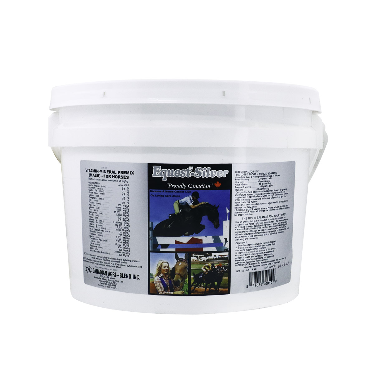 Equest™ Silver Features: • Top Dress daily grain ration at 30 - 60gms/ head / day. • Improves conditioning, hair, hoof Quality, and temperament. • Contains B-Complex Vitamins for stress • Can be fed with EQUEST™ Agri-Blok 8:8 or EQUEST™ 12:10 Salt Mineral. • Available in 4, 9 and 18 Kg Pails HORSE & FOAL We offer nine horse supplement formulations proven to promote general conditioning, improve hair and hoof quality, temperament, and assist nutrient absorption. Developed over 35 years of testing, these essential protein, mineral and vitamin supplements insure your horse's health and protect your equine investment. GUARANTEED ANALYSIS Crude Protein (min.) ........................................... 9.0% ECP/NPN (max.).................................................... 0.0% Crude Fat (min.) ................................................... 1.3% Crude Fibre (max.) ............................................... 3.0% Calcium (act.)........................................................ 3.5% Phosphorus (act.) ................................................ 2.5% Salt (act.) ............................................................... 5.0% Sodium (act.) ........................................................ 2.0% Fluorine (max.)........................................... 200 mg/Kg Magnesium (act.) ................................................. 0.4% Potassium (act.).................................................... 0.4% Sulfur (act.)............................................................ 0.5% Iron (act.) ................................................. 5,000 mg/Kg Copper (act.) ........................................... 1,400 mg/Kg Zinc (act.)................................................ 10,000 mg/Kg Manganese (act.) .................................... 5,000 mg/Kg Cobalt (act.) ................................................ 200 mg/Kg Iodine (act.)..................................................... 4 mg/Kg Selenium (act.).............................................. 25 mg/Kg Vitamin A (min.)...................................1,100,000 U/Kg Vitamin D (min.).....................................250,000 IU/Kg Vitamin E (min.) ........................................ 2,200 IU/Kg Vitamin B-12 (min.) .............................. 4,500 mcg/Kg Vit. K (Menadione) (min.) ............................ 35 mg/Kg Thiamine (min.).......................................... 700 mg/Kg Riboflavin (min.) ..................................... 1,300 mg/Kg Niacin (min.) ........................................... 2,500 mg/Kg Pantothenic Acid (min.)............................. 535 mg/Kg Choline (min.) ....................................... 17,400 mg/Kg Folicin (min.)............................................... 450 mg/Kg Pyridoxine (min.) ....................................... 300 mg/Kg Biotin (min.) ................................................. 70 mg/Kg Vit. C (Ascorbic Acid) (min.) ...................... 500 mg/Kg