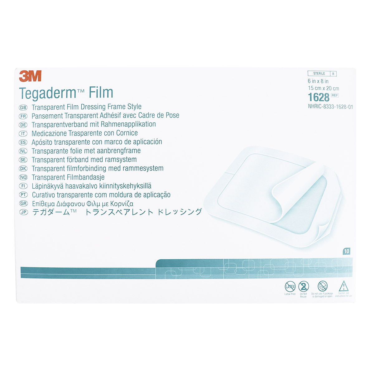 Tegaderm™ Transparent Film Dressing, Frame Style, Basic Manufacturer Number: 3M1628 Length: 20 cm Width: 15 cm Brand: Tegaderm™ Packaging: 10 each/box, 8 box/case Product Description: Allow easy monitoring of wounds and I.V. sites without the need to remove the dressing. Secure adhesion, yet gentle to the skin. Feature / Property: • Framed Delivery System allows for one handed application • Waterproof • Breathable allows oxygen in and moisture vapor out. • Impermeable To Liquid/Bacteria/Virus • Sterile