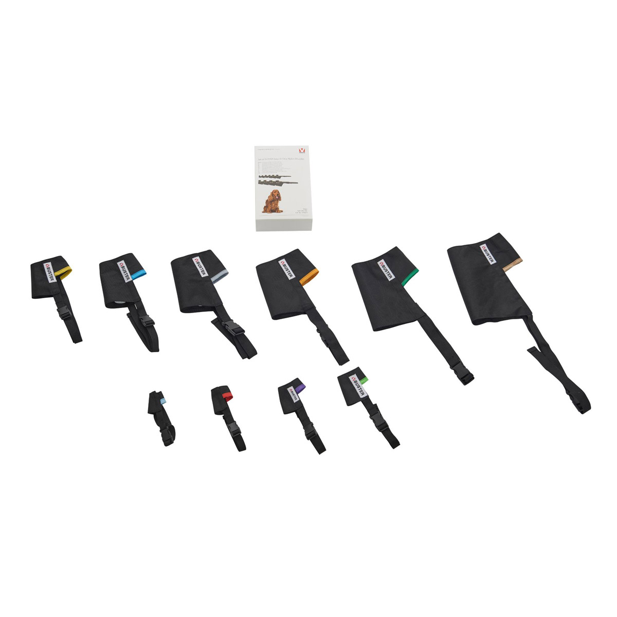A Snug fitting muzzle with click-lock clamp, adjustable strap and Easy ID color coding so you can find the right size in an instant. Machine washable up to 30 degrees Celcius. Features: *High quality water resistant lightweight nylon material *Color coded for easy recognition * Extra padding around the nose *Muzzle fits securely with adjusting straps for a snug fit *Easy release side snap buckle * Reinforced stitching to ensure long-lasting use. Set of 10 sizes: 1 each of XX Small - 5XL